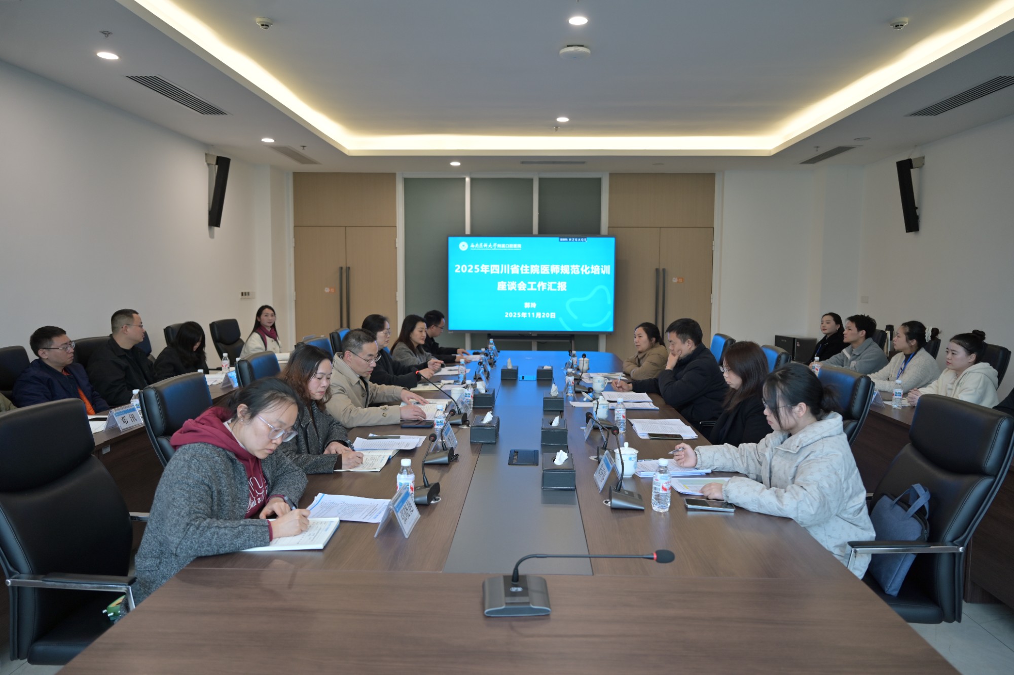 2025年11月20日,四川省医学科技教育中心主任毕明帅、副主任郝汉君、毕业后教育部副部长余锦辉等一行4人,莅临我院开展住院医师规范化培训(以下简称“住培”)与科研平台建设专题调研与指导。医院党委副书记、院长肖金刚,党委委员、副院长郭玲,及相关职能部门负责人、住培各专业基地管理人员参会并交流。