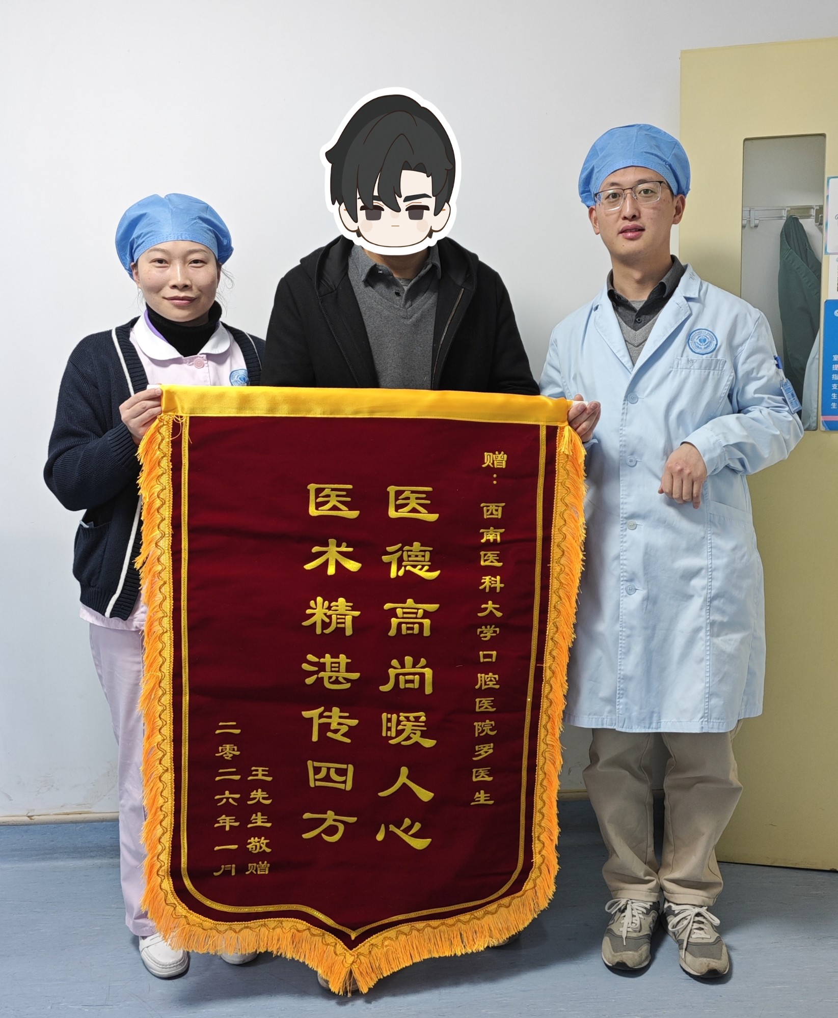 近日,西南医科大学附属口腔医院种植科诊室内暖意融融。患者王先生将一面印着“医德高尚暖人心,医术精湛传四方”的锦旗,亲手送到种植科罗世洪医生手中,以此感谢罗医生为其解决缺牙困扰,助他重获健康的咀嚼功能。