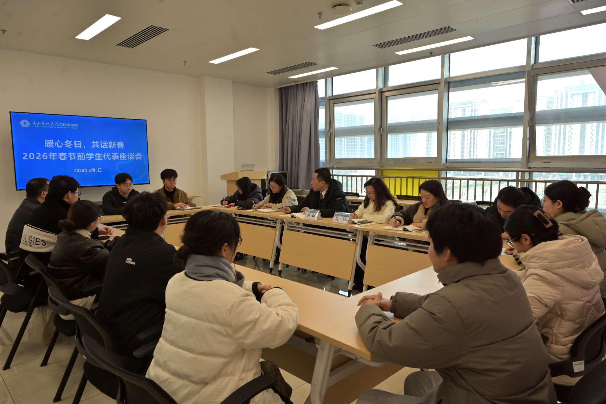 新春将至,岁寒情暖。2月3日,口腔医学院2026年春节前学生代表座谈会在云峰路院区口腔修复科学习室举行。学院党委书记唐柯同志,党委副书记、纪委书记黄钰同志,学科建设与研究生管理科、学生科等科室负责人以及本科生、研究生辅导员和研究生、本科生代表齐聚一堂,围绕同学们近期的科研进展、临床实践与学习生活等情况开展座谈交流,学院向同学们致以新春祝福。