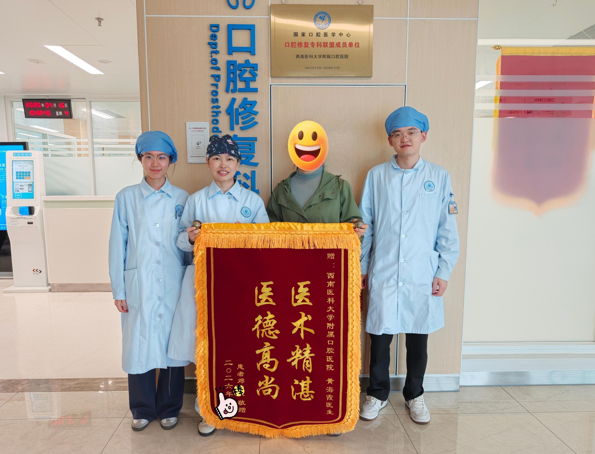 近日,西南医科大学附属口腔医院口腔修复科黄海霞医生团队收到了一份特殊的礼物——患者邓女士专程送来的锦旗。鲜红的锦旗上,“医术精湛 医德高尚”八个烫金大字熠熠生辉,既是对医生专业能力的高度认可,更是对团队暖心服务的最好褒奖。